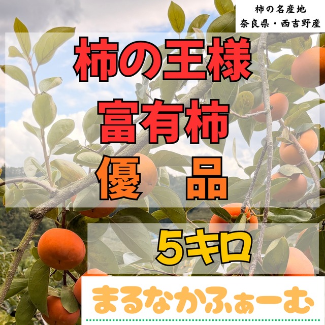 富有柿5Kg【優品・大玉】 商品例のように、見た目が奇麗でサイズも2L以上(260g~)となります。 ★★いよいよ収穫が始まりました!★★ 高級柿の産地として有名な奈良県五條市西吉野で栽培した柿の王様と称される富有柿です。 多くの方に安心して食べて頂けるように減農薬栽培を行い、栽培農地内への除草剤も不使用です。害獣避けフェンス周辺など栽培農地外の草刈り困難な場所にのみ除草剤散布を行っています。肥料も化学肥料に頼りきるのではなく、土壌分析を行い必要な栄養素を有機質肥料で可能な限り賄うようにしています。 ☆☆下記注意事項のご確認をお願い致します☆☆ ●表面に白い粉状のものが付着している事もありますが、農薬などではなく、柿が自らの乾燥を防ぐために出しているブルームと呼ばれる物で害はありません。 ●箱、梱包材込み5kgで発送致します。柿の正味量は4.6kg程度です。 ●直販もしていますので、売れ行きによっては予告なく販売終了させて頂く場合もありますのでご了承ください。 ●保存方法:直射日光を避けて冷暗所にて保存してください。 ●発送前に検品は十分に行なっていますが、生果物なので輸送中に傷んだり、追熟してしまう可能性もあります。特に北海道や沖縄、離島は到着まで日数がかかりますのでご注意ください。生果物である事をご理解ください。生果物ですので、発送後の返品、返金は致しかねます。ご購入前に必ずご確認ください。 #柿 #富有柿 #奈良県産 #西吉野産 #まるなかふぁーむ