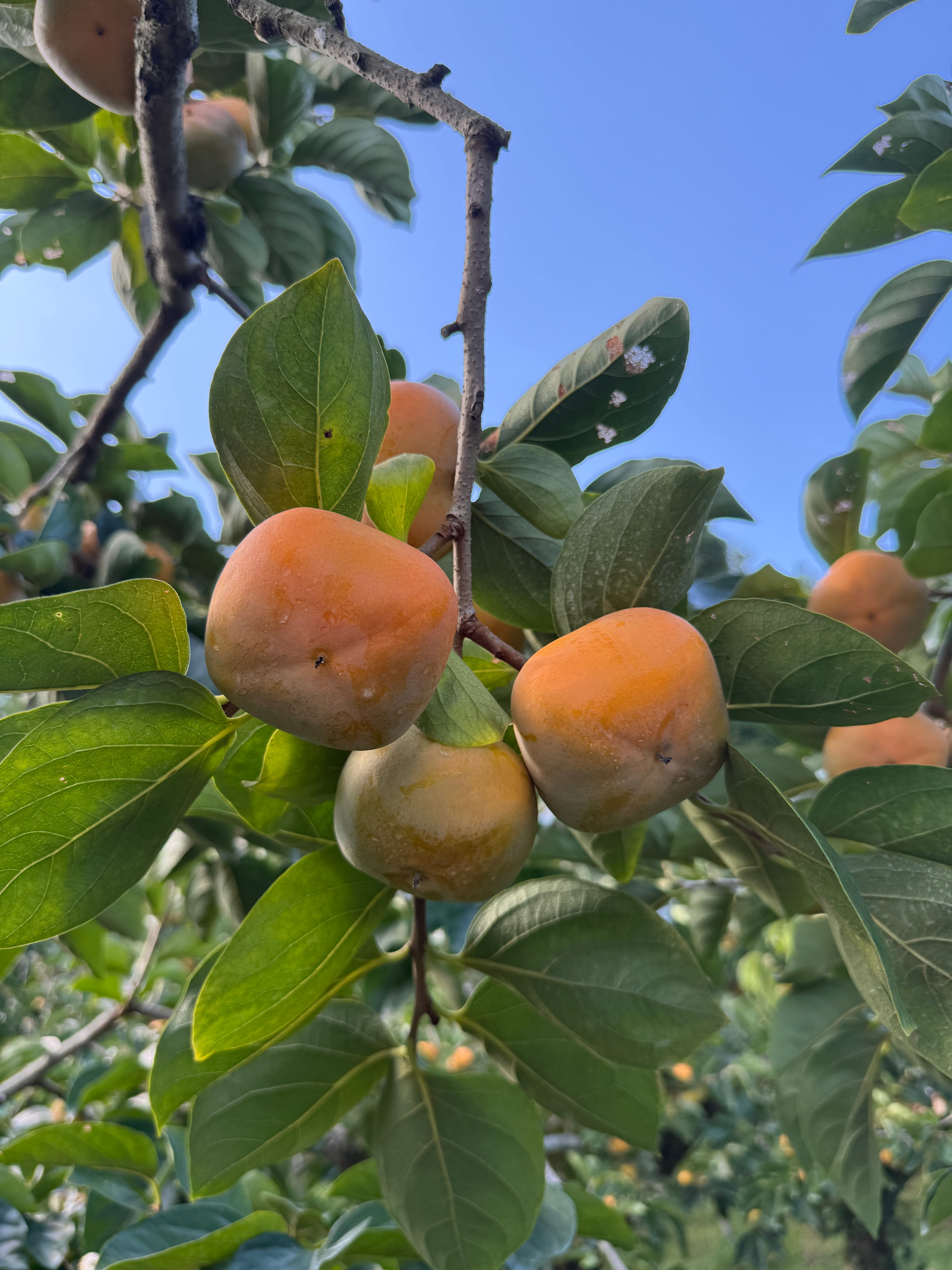 ●表面に白い粉状のものが付着している事もありますが、農薬などではなく、柿が自らの乾燥を防ぐために出しているブルームと呼ばれる物で害はありません。