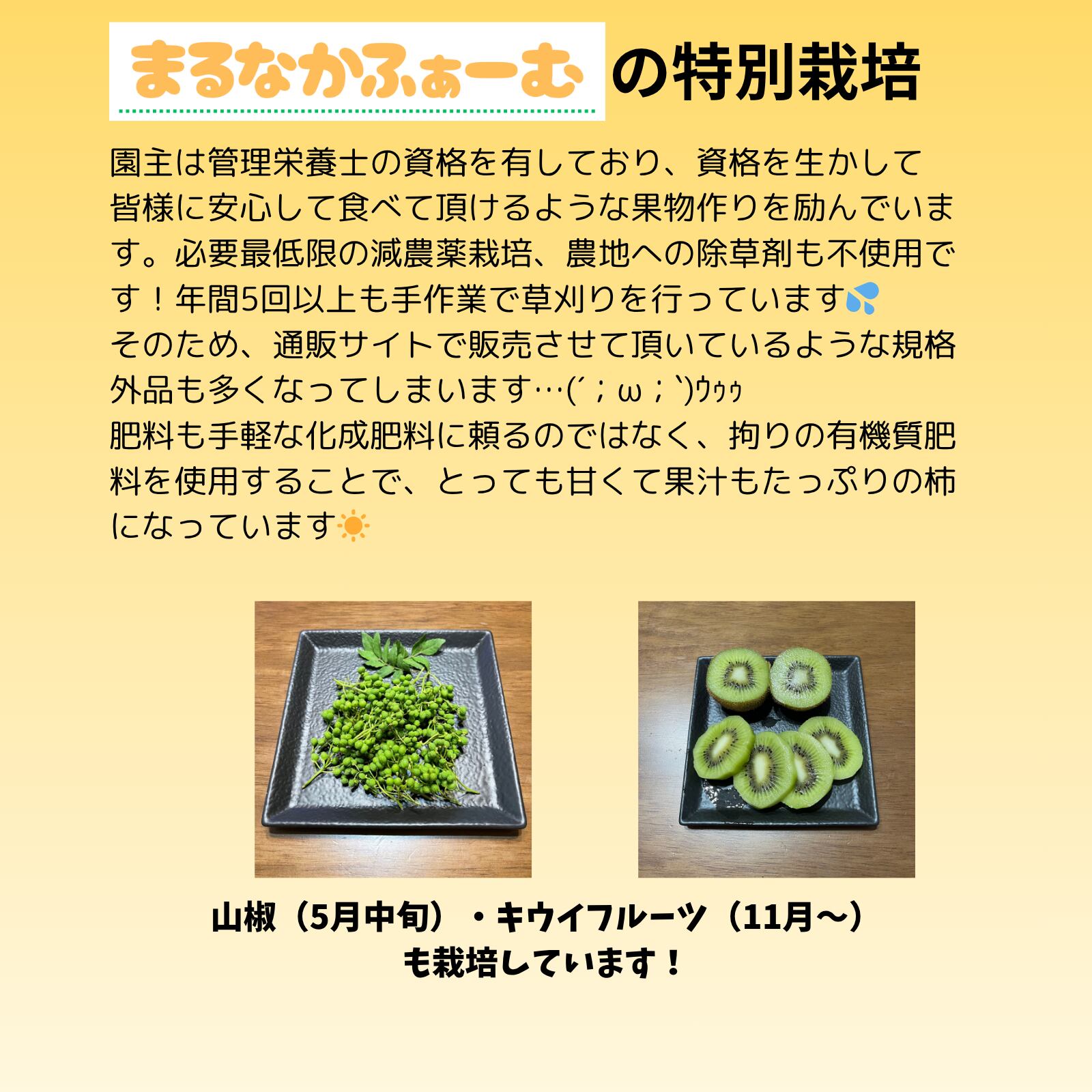 ●表面に白い粉状のものが付着している事もありますが、農薬などではなく、柿が自らの乾燥を防ぐために出しているブルームと呼ばれる物で害はありません。